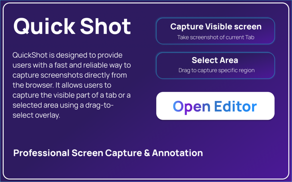 QuickShot is a Chrome extension that lets you capture screenshots instantly, edit them inside the browser, and share or download them without any hassle. Unlike heavy desktop software, QuickShot works directly in Chrome and focuses on speed, privacy, and usability.