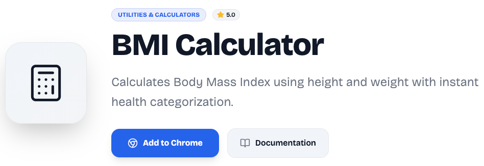 This extension allows users to calculate their Body Mass Index directly from their Chrome browser in just a few seconds. With a clean interface and instant results, it makes health tracking easy and accessible.
