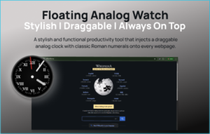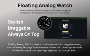 Floating Analog Watch is a lightweight Chrome extension that shows a real-time analog clock overlay on any website. After installation, it automatically appears on webpages once you refresh them. The clock runs according to your system time and updates every second.