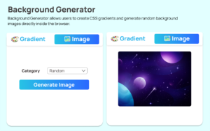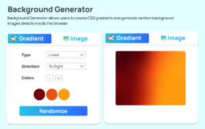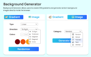 This tool is designed to help users create CSS gradients and generate random background images directly inside the browser. The best part? Everything runs locally within the popup, meaning it’s fast, secure, and doesn’t rely on external processing.