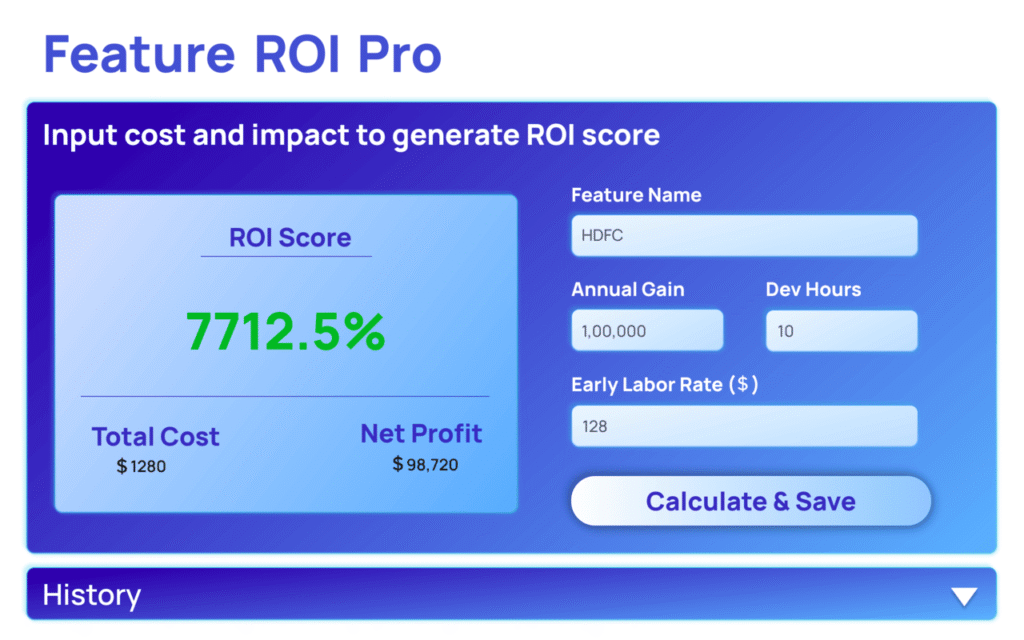 Feature ROI Pro is a browser extension that helps product teams evaluate feature ideas based on ROI. Instead of relying on assumptions or gut feelings, you can calculate expected value vs. cost and make informed prioritization decisions.