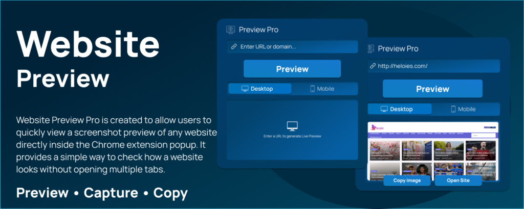 Website Preview Pro is created to make website previewing simple, quick, and efficient. Its main motive is to provide users with a screenshot preview of any website directly inside the Chrome extension popup. This means you can check a site’s appearance without navigating through multiple tabs.
