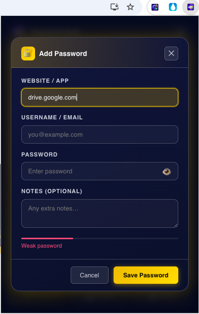 Before using this extension, I rarely thought about how strong my passwords were. The built-in password strength indicator gives visual feedback when creating new credentials.